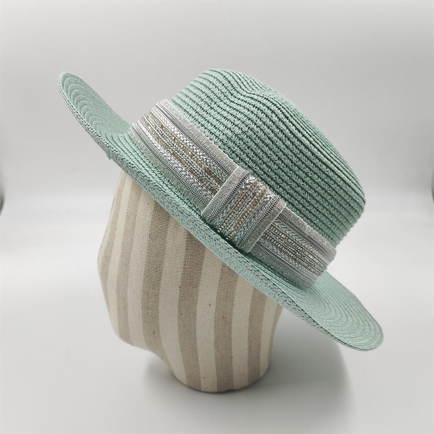 Voici le ravissant "Chapeau Habillé Femme Vert d'Eau et Argent", un accessoire mode qui évoque la fraîcheur et la légèreté. Avec sa calotte arrondie et sa teinte vert d'eau délicate, ce chapeau de paille vous transporte dans une atmosphère estivale empreinte de douceur. Son bandeau en tissu couleur argent ajoute une touche de sophistication et de contraste subtil.
